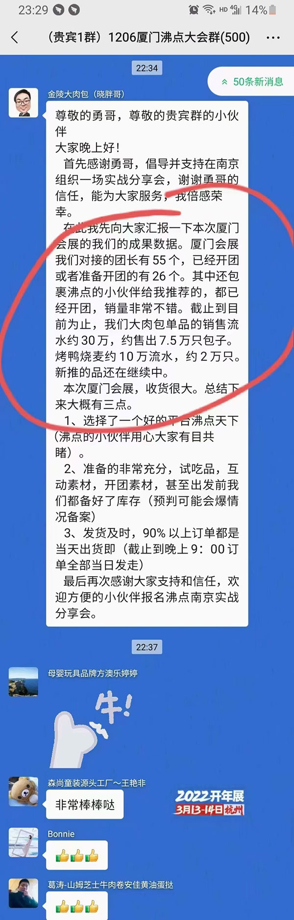 在此我先向大家汇报一下本次厦门会展的我们的成果数据。厦门会展我们对接的团长有55个,已经开团或者准备开团的有26个。其中还包裹沸点的小伙伴给我推荐的,都已经开团,销量非常不错。截止到目前为止,我们大肉包单品的销售流水约30万,约售出7.5万只包子。烤鸭烧麦约10万流水,约2万只。新推的品还在继续中。