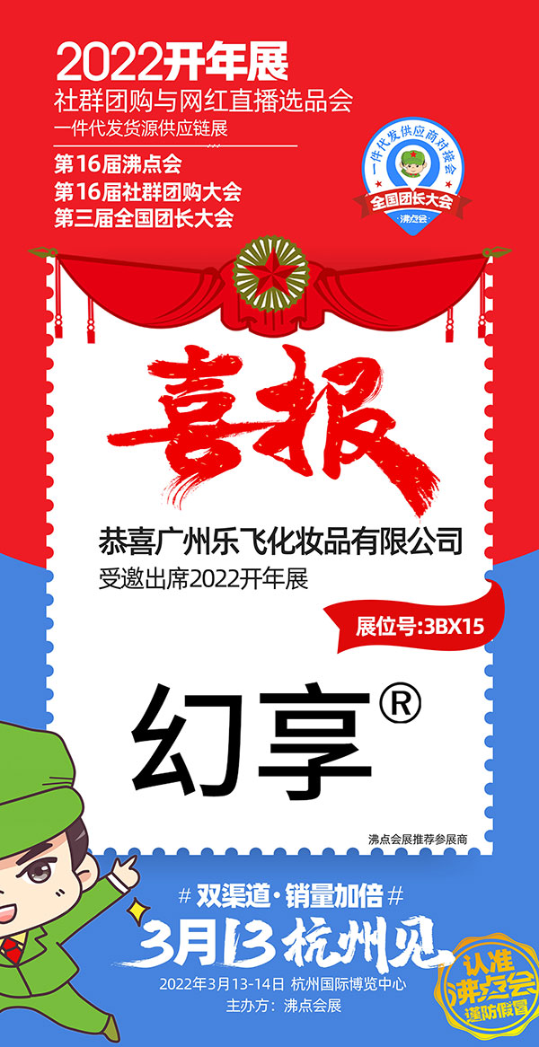 3月13号在杭州举办的2022杭州团长大正在筹备中,来自主办方沸点天下的消息,本届的展位面积30000平米,展商数量800+,新品爆品10000+,渠道方1000+,行业观众10000+。届时,广州乐飞化妆品有限公司旗下品牌幻享T8受邀参展。