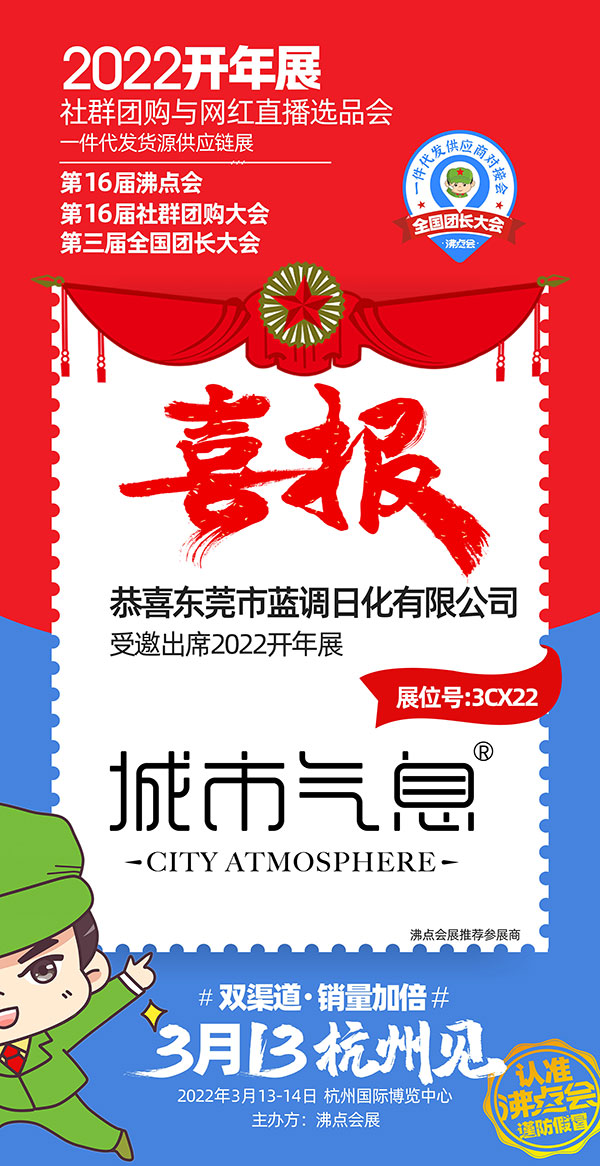2022杭州团长大会定于2022年3月13-14号在杭州国际博览中心,目前正在进行展位招募,参展商和平台方都在踊跃报名中,东莞市蓝调日化有限公司受邀参展本次展会。