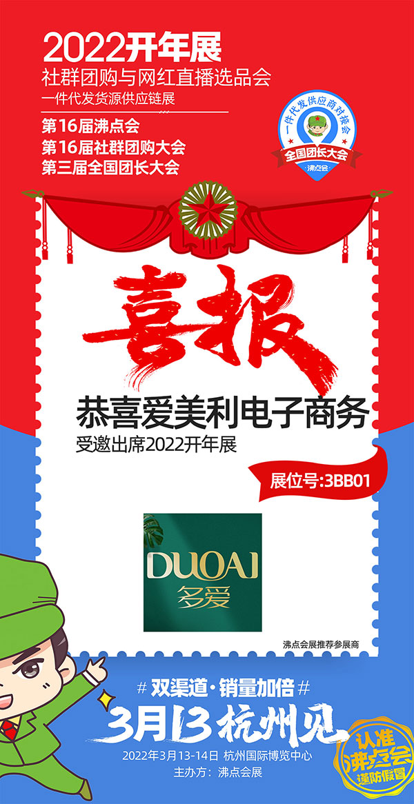 2022杭州团长大会定于2022年3月13-14日举办,主办方是沸点会展(广州)有限公司!大会分为3大馆,6大展区。目前正在进行展位招募,参展商和平台方都在踊跃报名中,广州市爱美利电子商务有限公司旗下品牌多爱将亮相此次活动!