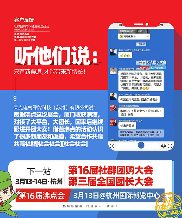 下面是莱克电气在参加完12月6号厦门会后的反馈:感谢沸点这次展会,厦门收获满满,对接了大平台,大团长,回来后继续跟进开团大卖!借着沸点的活动认识了很多新朋友和渠道…