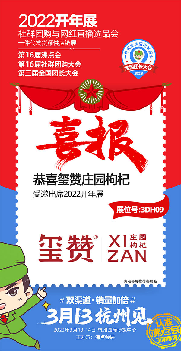由沸点天下创办、沸点会展主办的2022杭州团长大会定于2022年3月13-14日举办,大会分为3大馆,6大展区。目前正在进行展位招募,玺赞庄园枸杞有限公司将受邀参展此次活动!