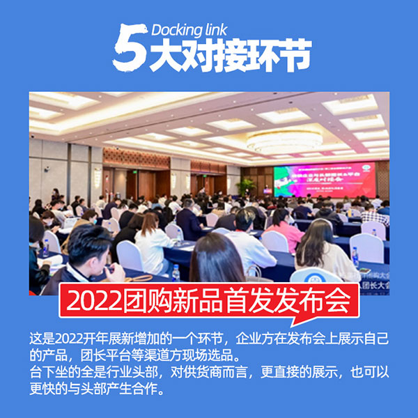 团长大会有5大环节:2022团购新品首发发布会,第3届全国团长大会,沸点之夜资源对接晚宴,新渠道大会,以及渠道选品对接会。