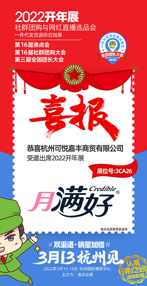 由社群电商引领者沸点天下创立、沸点会展主办的2022杭州全国团长大会,一件代发货源对接会将于2022年3月13-14日,在杭州国际博览中心举办!目前正在进行展位招募,参展商和平台方都在踊跃报名中,个人卫生护理领域的民营独资企业——杭州可悦嘉丰商贸有限公司受邀参展本次展会。