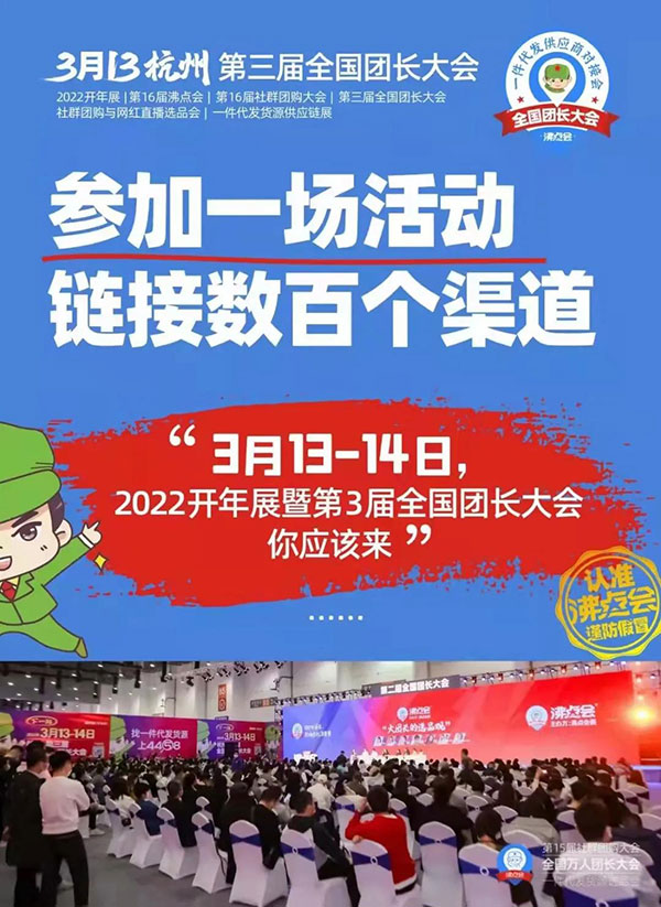 3月13-14号,第3届全国团长大会,社群界头部的平台和团长都将出席,并且现场选品。如果你是保健养生类产品的供货商,想要链接平台和团长,欢迎参加本次大会,现场对接资源,实现销售增长。