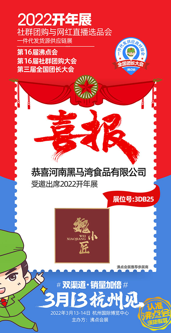 2022杭州团长大会定于2022年3月13-14号在杭州国际博览中心举办,目前正在进行展位招募,参展商和平台方都在踊跃报名中,河南黑马湾食品有限公司也将受邀参展本次展会。