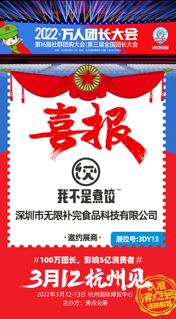 2022杭州团长大会将于2022年3月12-13日在杭州国际博览中心隆重举办,分为二天一夜在杭州国际博览中心举办!大会分为3大馆,6大展区,展位面积30000平米,展商数量800+,新品爆品10000+,渠道方1000+,行业观众10000+。届时,深圳市无限补完食品科技有限公司旗下品牌我不是煮饺受邀参展!