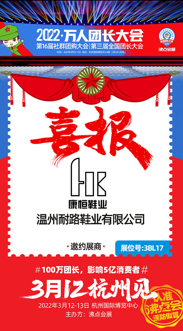 杭州全国团长大会,一件代发货源对接会将于2022年3月12-13日,在杭州国际博览中心举办!此活动展位面积30000平米,展商数量800+,新品爆品10000+,渠道方1000+,行业观众10000+。如此盛典,温州耐路鞋业有限公司受邀参展!