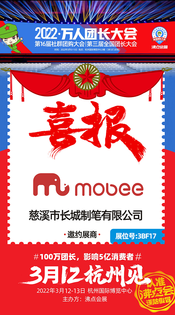 由沸点天下创办、沸点会展主办的2022杭州团长大会定于2022年3月12-13日举办,大会分为3大馆,6大展区,展位面积30000平米,展商数量800+,新品爆品10000+,渠道方1000+,行业观众10000+,目前正在进行展位招募,慈溪市长城制笔有限公司受邀参展此次活动!