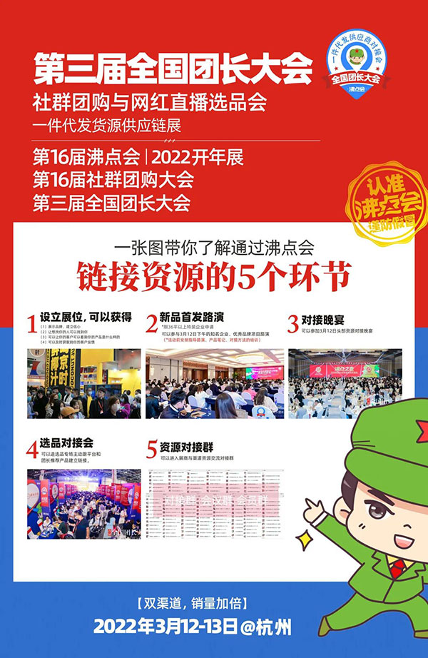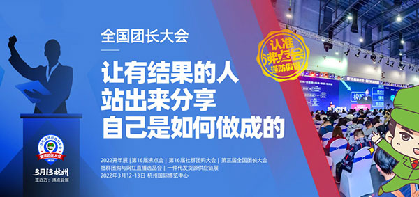 3月12-13日,在杭州国际博览中心,第3届全国团长大会暨2022春季一件代发货源展,第16届沸点会即将举办。