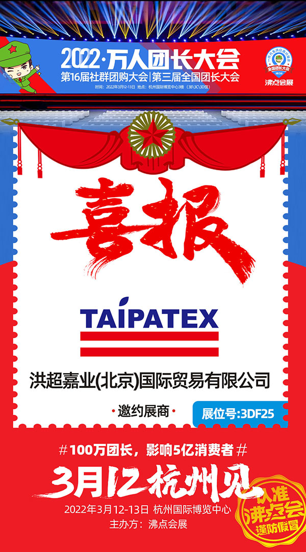 由沸点会展主办的2022开年展暨第16届沸点会(杭州)供应链展、社群团购与直播选品会、第三届全国团长大会&一件代发货源对接会系列活动将于3月12-13日在杭州国际博览中心隆重举办,聚焦双渠道、销量增长加倍。届时,洪超嘉业(北京))国际贸易有限公司受邀参展。