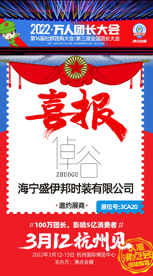 由沸点会展主办的2022开年展暨第16届沸点会(杭州)供应链展、社群团购与直播选品会、第三届全国团长大会&一件代发货源对接会系列活动将于3月12-13日在杭州国际博览中心隆重举办,聚焦双渠道、销量增长加倍。届时,海宁盛伊邦时装有限公司受邀参展。