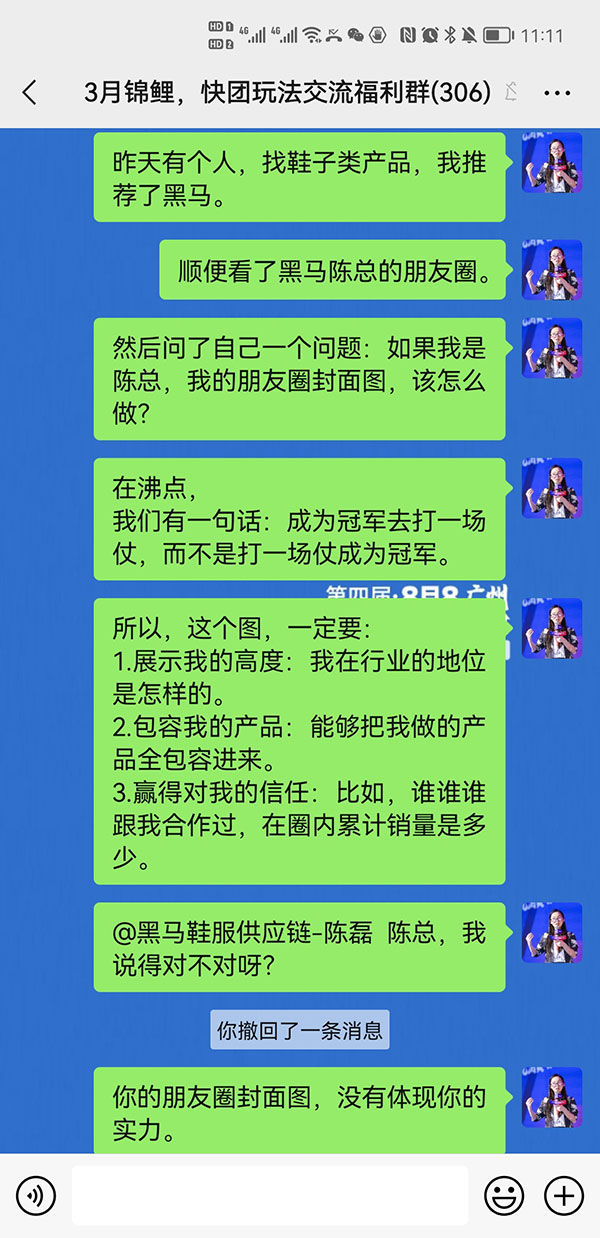 在3月锦鲤活动群里,勇哥有邀请团长进群,并在群里做分享与答疑。