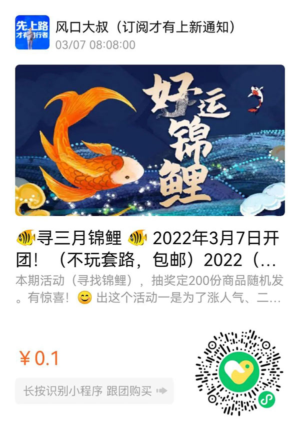 对,还做了一个《3月锦鲤》的活动,3天时间勇哥快团团帐号涨粉3000,并建了一个300人的微信群,并做了2次这个活动的复盘培训,也是吸引了很多人的认同与关注。