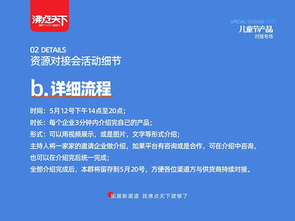 1.形式:线上以快闪群形式,5月11号建群,5月12号为主要推品对接日,5月20号解散。