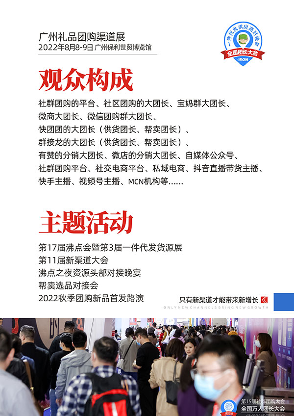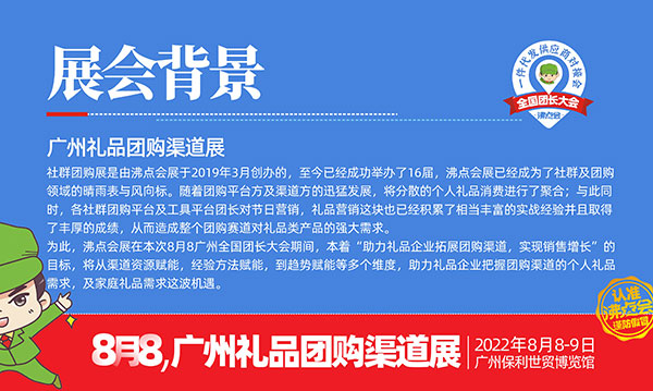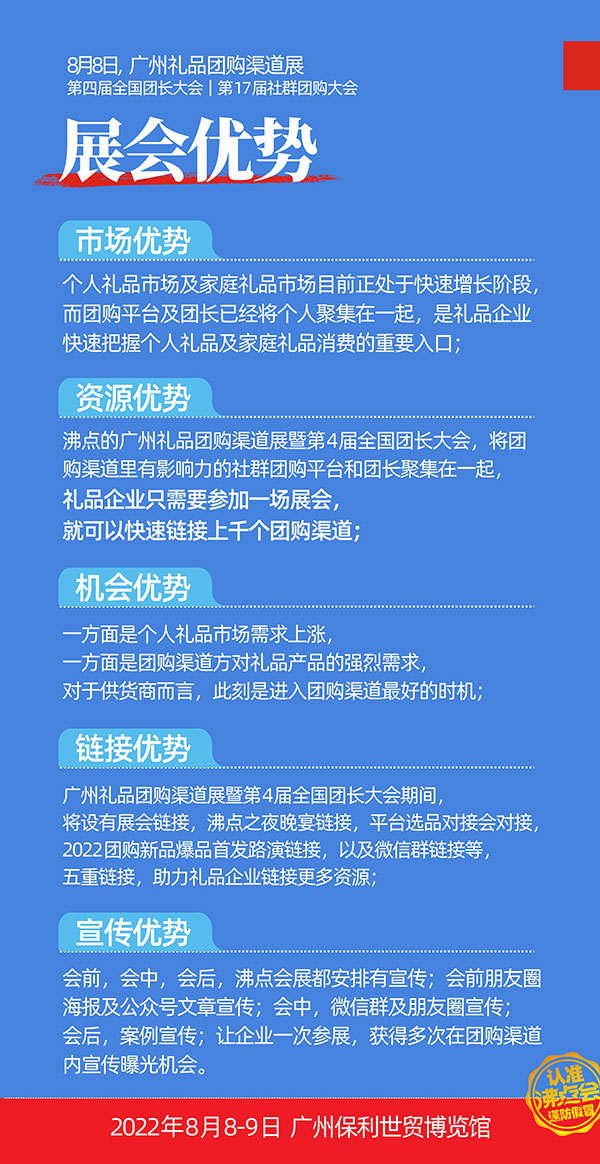 链接优势:广州礼品团购渠道展暨第4届全国团长大会期间,将设有展会链接,沸点之夜晚宴链接,平台选品对接会对接,2022团购新品爆品首发路演链接,以及微信群链接等,五重链接,助力礼品企业链接更多资源;