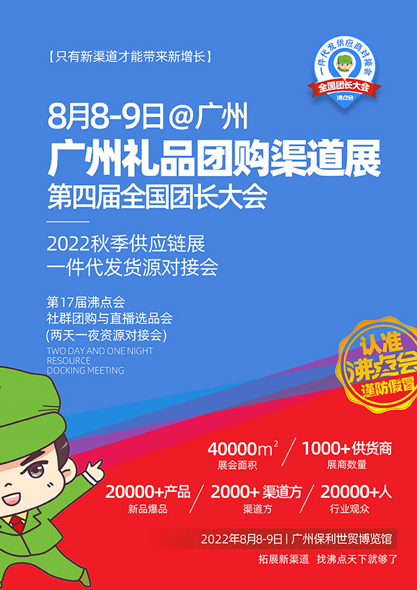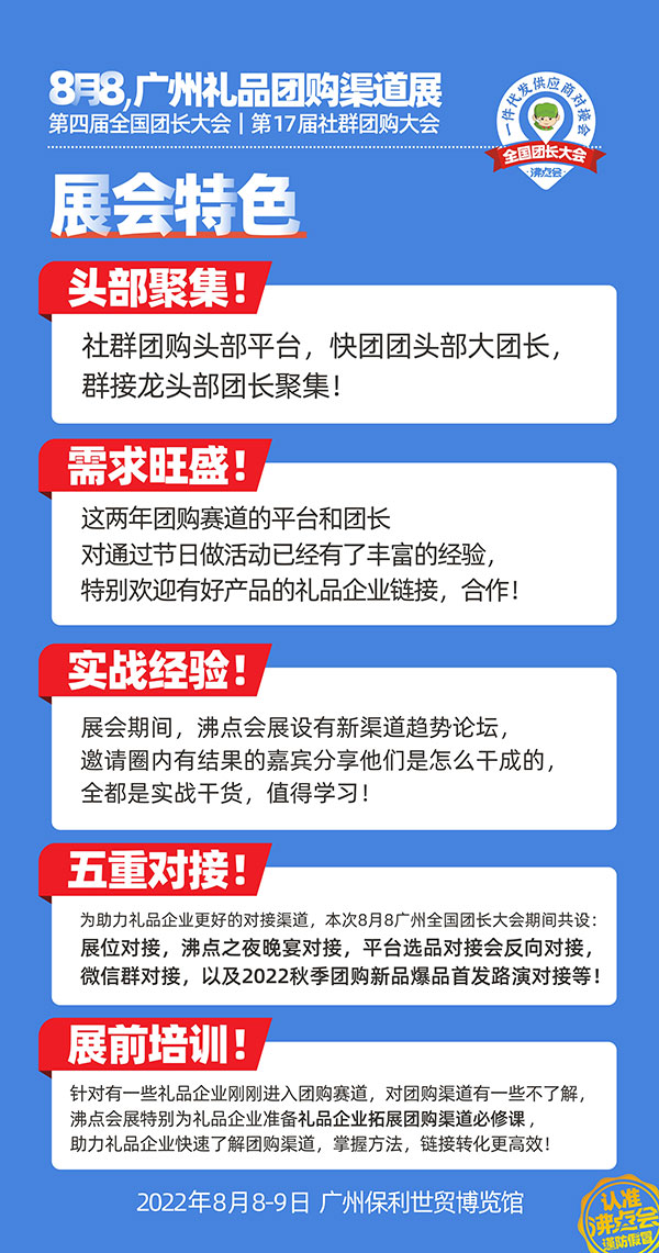 五重对接!为助力礼品企业更好的对接渠道,本次8月8广州全国团长大会期间共设:展位对接,沸点之夜晚宴对接,平台选品对接会反向对接,微信群对接,以及2022秋季团购新品爆品首发路演对接等!