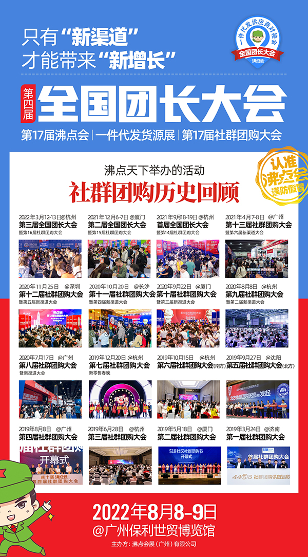 8月8号,由沸点会展举办的第4届全国团长大会将在广州保利世贸博览馆举办,据说行业头部渠道,头部大团长,头部大平台都会报名来参加,一个展位,2天时间可以对接几百个渠道,想要拓展新渠道实现销售增长的企业一定要来报名!