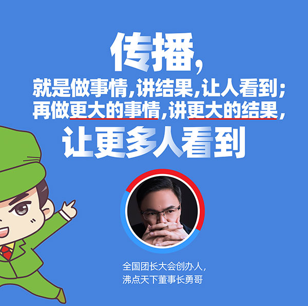 勇哥常说一句话“传播,就是做事情,讲结果,让人看到;再做更大的事情,讲更大的结果,让更多人看到。“