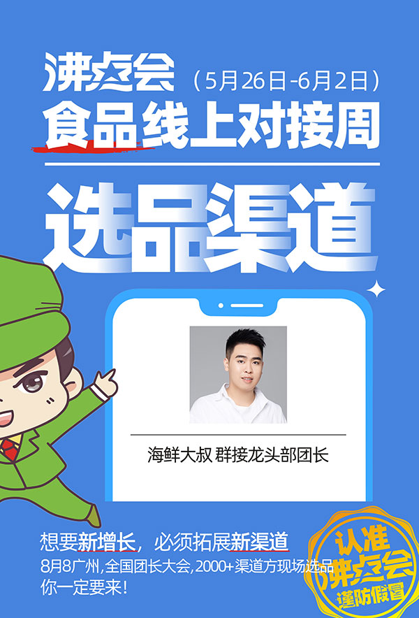 5月26日-6月1日,为助力食品企业精准对接社群渠道资源,把握社群食品品类的销售增长机遇,沸点会展特打造【沸点会.食品对接专场】,为食品产品企业提供一个与社群团购平台及团长专场的对接机会,从而让双方快速精准对接,实现销售增长。