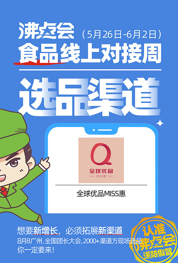2022年5月26日-6月1日,沸点会.食品线上对接周,共分6个主题,有网红休闲零食;预制冷冻;方便食品烘焙产品;地方特产水果;饮料酒水粮油调味;大健康营养功能及滋补食品等6个主题,并将邀请社群赛道头部的社群团购平台,头部的快团团大团长,群接龙大团长参加本次线上选品。