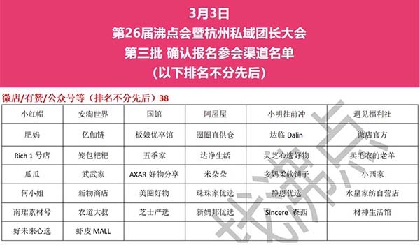 做私域,找沸点!3月2-4日,已确定第26届沸点会暨杭州私域直播选品会的微店/有赞/公众号等渠道名单,共计38个,更多渠道正在加入中。